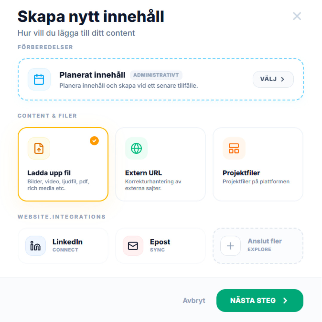 Vår plattform är skapat för att hantera både off-line och on-line material sömlöst. Skapa utkast för sociala medier direkt i plattformen eller ladda upp färdiga produktioner för godkännande.