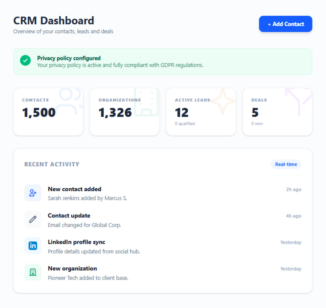 Vår dashboard är utformad för att ge en omedelbar överblick över kontakter, organisationer och leads. Allt presenterat i ett rent och modernt gränssnitt som gör det enkelt att navigera och agera snabbt på nya affärsmöjligheter.