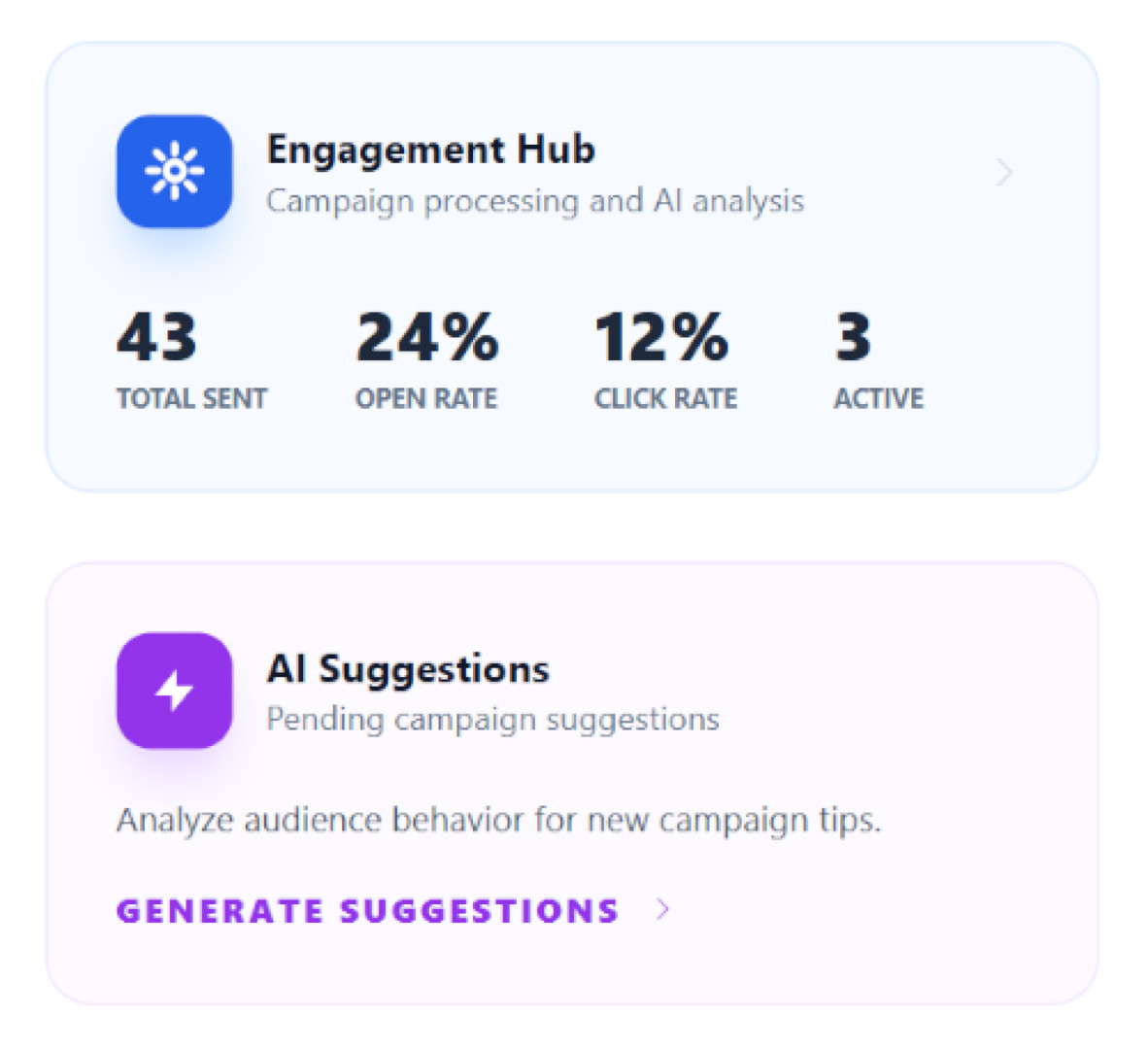 Engagement Hub kopplar samman ditt CRM med dina marknadsföringsverktyg. Se exakt hur dina leads interagerar med dina kampanjer i realtid. Sluta gissa – börja agera på faktisk kundinteraktion direkt från din dashboard.