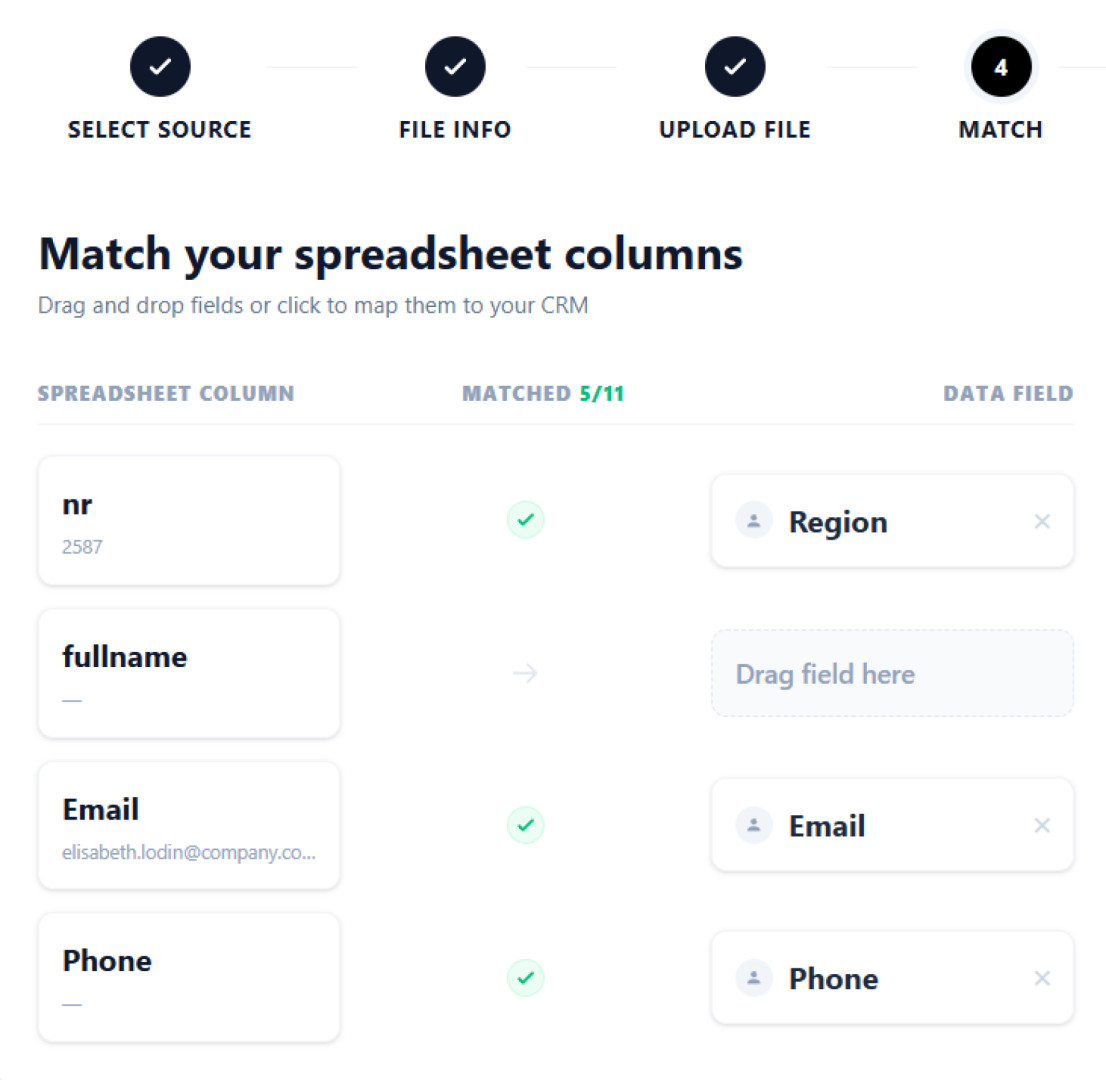 Undvik manuellt arbete med Excel-filer. Vårt intelligenta importverktyg hjälper dig att mappa kalkylbladets kolumner direkt mot CRM-fält. Med ett intuitivt gränssnitt ser du direkt vad som matchar och vad som behöver justeras.