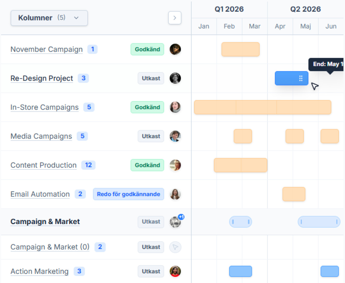 Att justera marknadsplanen ska inte kräva tjugo klick. I vår interaktiva Gantt-vy drar du enkelt en aktivitet till ett nytt datum eller förlänger dess tidsperiod direkt i tidslinjen.
