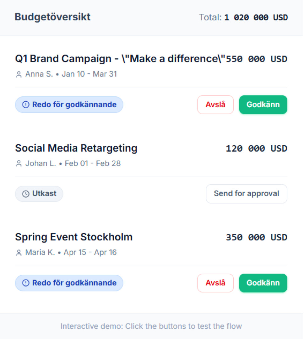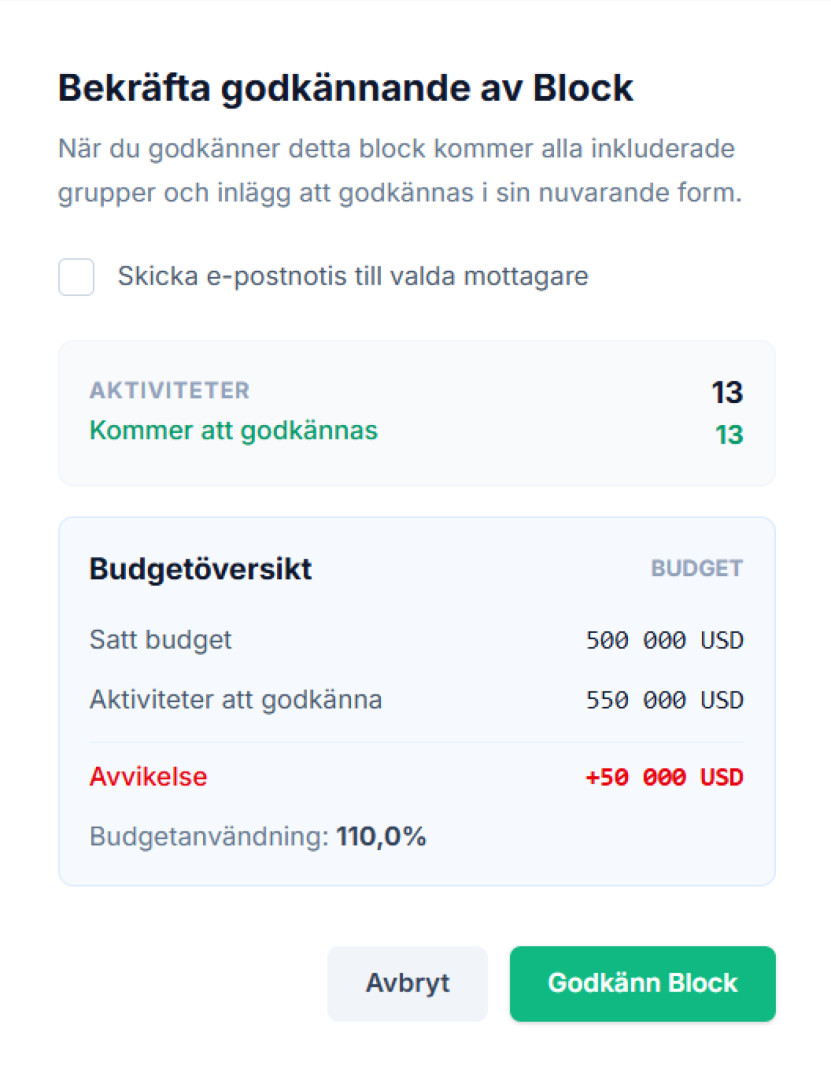 Säkerställ att budgeten håller innan ni går live. Få en tydlig överblick över budgetanvändning och avvikelser direkt i godkännandevyn.