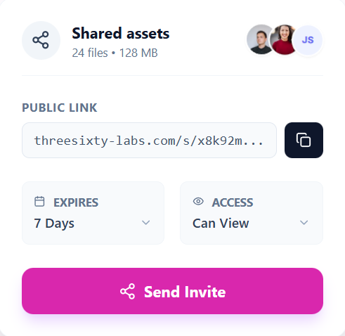 Leverera material till kunder och samarbetspartners utan att behöva bjuda in dem till plattformen. Skapa säkra, tidsbegränsade länkar med specifika behörigheter – så att ditt varumärkes IP är skyddat samtidigt som samarbetet går snabbt.